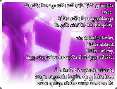 Feizal... Dia datang pada saat dimana aku sedang merasa sangat kehilangan, hari-hariku sedang membosankan dan menyedihkan. Aku baru saja patah hati dan mulai kehilangan arah. Awal aku mengenalnya saat aku mengikuti sebuah organisasi disekolahku (SMK). Ketika ada sebuah kegiatan organisasi, di mana pada kegiatan tersebut terdapat outbond yang cukup menakutkan buat kaum cewek, kita harus melewati sebuah sungai yang aliran airnya cukup deras, saat aku menuruni sebuah tebing menuju sungai, tiba-tiba aku terpeleset dan hampir saja terjatuh, namun karena adanya seseorang yang membantu menopangku akhirnya aku tidak terjatuh...(hhuffttt,,,sungguh tak terbayangkan bila tak ada dia yang menopangku)...hhaha lebeh dikit gapapa yah Entahlah, aku tidak tahu kapan cinta itu hadir dalam hatiku dan aku juga tak mengerti mengapa cinta itu datang begitu cepat. Dan yang lebih aku tak mengerti mengapa aku harus mencintainya saat dia telah bersama cewek lain yang masih satu angkatan juga satu sekolah dengan ku. Hubunganku dengan Feizal juga tak pasti, yang pasti aku pernah menyakitinya karena aku tak pernah merespon kasih sayang yang dia berikan padaku saat aku masih belum menyadari perasaanku sebenarnya karena aku terlalu dibutakan oleh Arfa. Aku selalu saja membanggakan Arfa dihadapan Feizal, dan hal itulah yang membuat Feizal mundur untuk mendapatkan hatiku dan pergi bersama cewek lain. Hati ini memang terasa sangat sakit setelah mengetahui Feizal bersama cewek itu, namun sikap Feizal tak begitu berubah meskipun dia telah memiliki pacar, mungkin hal itulah yang membuatku yakin tuk tetap bersabar menunggunya. Saat aku mulai merasa benar-benar sayang terhadap Feizal, dan mulai melupakan Arfa, tiba-tiba saja Arfa datang kembali dan meminta aku untuk kembali padanya. Aku tak mengerti apa yang telah terjadi? Arfa datang dengan kata-kata manis yang hampir membuatku jatuh lagi padanya. Namun, saat Feizal mengetahui hal ini, aku merasa sepertinya Feizal takkan pernah bisa merelakan aku tuk bersama dengan Arfa lagi karena dia telah mengetahui bahwa Arfa memiliki sifat playboy dan ujung-ujungnya pasti nyakitin hati aku lagi. Tapi hingga saat ini seolah Feizal tak menyerah untuk merubah pola pikirku agar aku bisa lebih dewasa lagi. Dia cukup memiliki nama yang tenar disekolahku, entah itu karena penampilannya, kebaikannya, kepintarannya, ataupun karena wajah dia yang begitu menarik. Saat pertama aku memasuki sekolahku, dan saat aku mengenalnya, tak pernah terpikir dalam benakku jikalau aku akan terjerat dalam kisah cintanya. Sungguh Arfa dan Feizal adalah dua sosok pribadi yang bertolak belakang,walaupun mereka memiliki talenta yang sama dalam bermain musik. Aku adalah seorang wanita, yang selama 2 tahun terakhir dilanda dilema dengan perasaanku sendiri. Secara jelas aku menjelaskan perasaanku terhadap 2 laki-laki itu pada perkenalan mereka. Aku seorang yang sangat simple dalam hal mencintai seseorang, aku selalu jatuh cinta karena hal-hal yang sederhana, tapi seringkali jatuh cinta tanpa sebuah alasan. Kadang perasaan itu datang tanpa aku tahu dan mengapa harus pada orang tersebut. Aku sudah bosan menjalani kegagalan perjalanan cintaku, beberapa bulan sebelum aku mengenal Feizal, aku sudah berniat untuk memilih seseorang yang lebih dewasa agar dia dapat menuntun kehidupanku. Selama beberapa bulan aku mengenal mereka, aku semakin yakin akan perasaanku. Tapi saat aku mengabaikan Arfa, keadaan sudah berubah, Feizal telah memiliki seorang cewek yang juga masih satu sekolah denganku. Aku tak tahu apakah dia masih memiliki perasaan terhadapku atau tidak, aku tak tahu. Saat aku mengabaikan Arfa, hatinya mungkin sangat terluka bahkan mungkin yang paling terluka adalah aku. Aku hanya memikirkan dan mengikuti perasaanku tanpa mau peduli perasaan orang lain, tapi apa yang aku dapat??? sekuat apapun aku meyakini perasaanku terhadapnya, toh sekarang aku yang terlambat. Mungkin ini karma untukku… Hal itu benar-benar membuatku semakin mengerti arti kasih sayang. Aku merasakan apa yang Arfa rasa, aku merasakan bagaimana rasanya diabaikan, mengharapkan sesuatu yang tak pasti, tapi aku juga tak ingin mengabaikan perasaanku, karena hubunganku dengan Feizal tak seperti yang aku harapkan. Dengan jelas dia mengatakan dia telah memiliki kekasih. Kisah ini bagaikan kisah cinta segitiga yang tak berujung. Jika aku tetap mementingkan perasaanku, ada seseorang yang terluka. Dan jika aku menerima cinta Arfa, aku sendiri yang akan terluka. Entah apa yang aku harus ku ucapkan dipenghujung kisah ini, maaf atau terimakasih, yang pasti aku mendapatkan satu pelajaran yang sangat berharga dari kisah ini, aku akan mengucapkan 2 kata itu sebagai kata terakhirku. Maaf untuk semua yang secara sengaja atau tidak sengaja terluka karena masalah ini, maaf untuk Arfa yang mungkin terluka, maaf untuk Feizal karena aku memaksakan sesuatu yang sudah pasti ku tahu itu tak mungkin. Perlu kau tahu, hati ini selalu terbuka untukmu Feizal. Terimakasih untuk semua yang telah ikut mengukir sebuah kisah ini untukku. Saat ini aku sedang mencoba untuk mengistirahatkan hati dan pikiranku, aku harus berusaha agar aku tak singgah lagi pada kisah yang sama… walau sulit, aku harus bisa merelakan dan melupakan semua… Aku telah menuliskan beberapa puisi sebagai siratan dari kisah ini…
